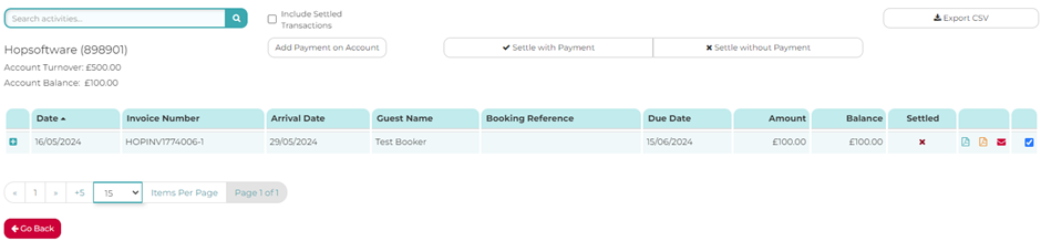 The balance for the invoice has now been updated to £100 and is now showing as unsettled.