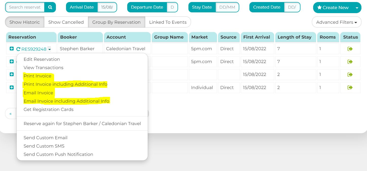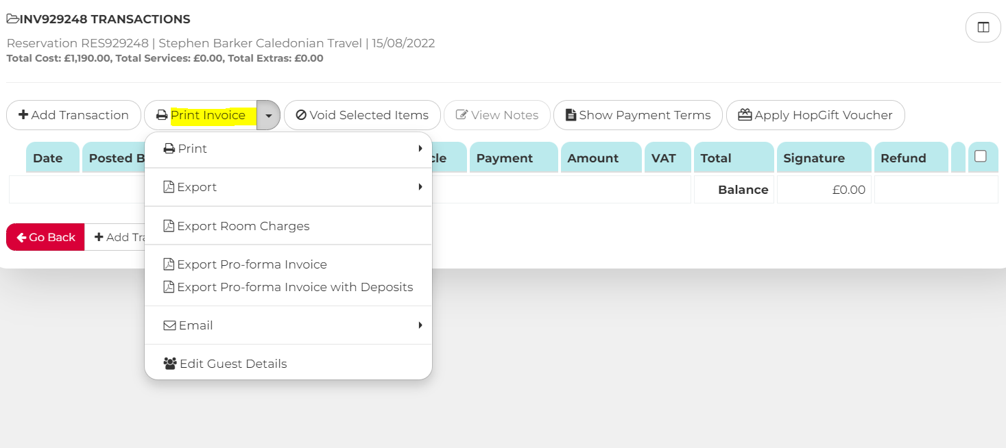Further invoice options (e.g. Pro-Forma Invoice) are available by selecting "View Transactions" from the reservation drop-down menu and then clicking on the relevant one: