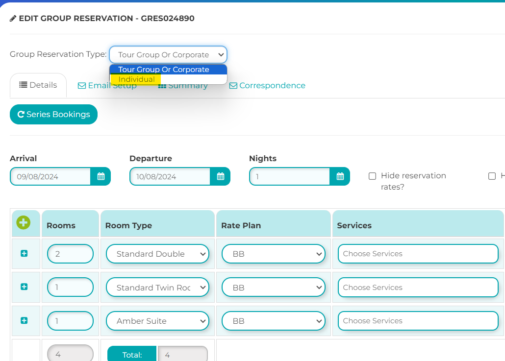 The way around this is therefore to always ensure that you are selecting the correct 'Group Reservation Type' when you create a Group Reservation. If you need to send out an email confirmation for a reservation that you have already created (e.g. to the organiser) then you can temporarily add them as a guest and as long as they have an email address you will be able to send the confirmation.