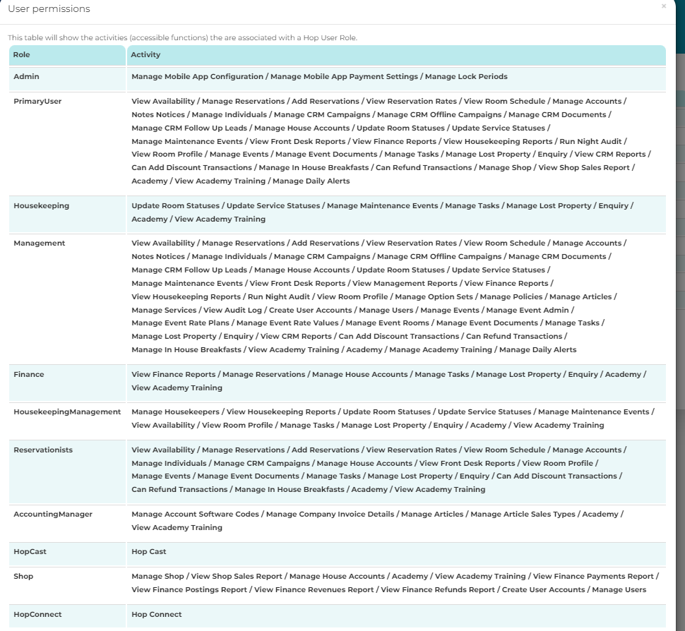 Go to Users > Manage Users and click on the 'Permissions and Activities' button located at the bottom of the screen. This will open a pop-up window that lists each of the Hop Roles available for you to assign to your staff.