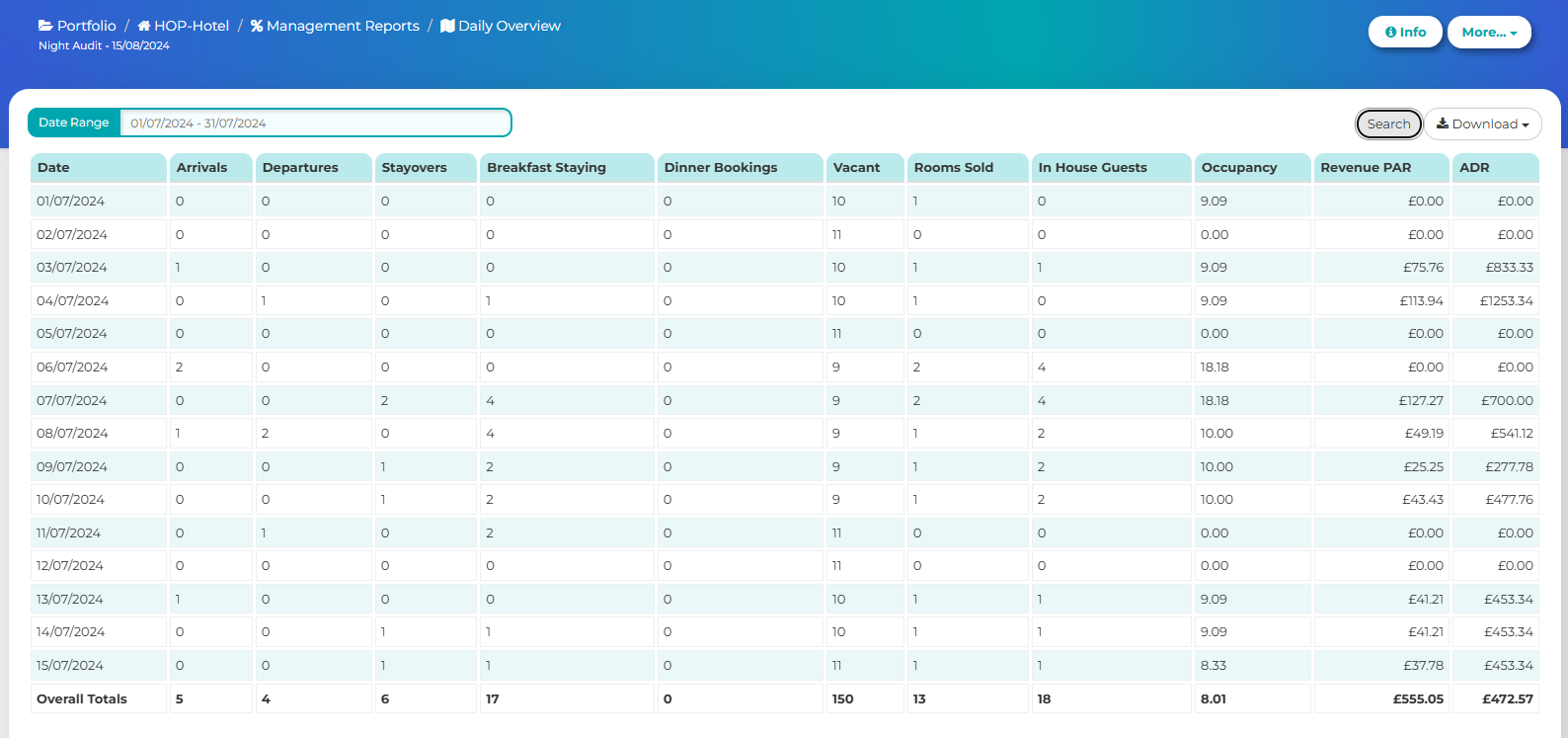 Arrivals, departures, stayovers, breakfast staying (based on the breakfast article set up under administration), dinner bookings (if linked to a booking system), vacant rooms, rooms sold, in house guests, occupancy %, rev par and ADR.