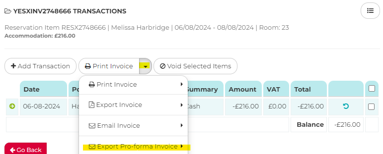 To do this click the drop down arrow next to "Print Invoice" then hover over "Export Pro-forma Invoice" then you will see a sub menu option called "Export pro-forma invoice with deposits" select this.