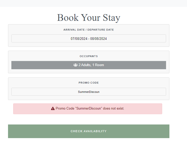 If the promo code is spelt incorrectly you will be presented with the error message “Promo Code does not exist”. This means the rate cannot be booked.